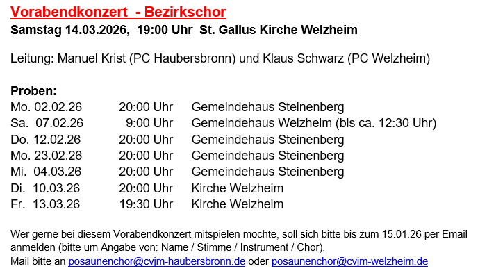 Wer gerne beim Vorabendkonzert am Samstag 14.03.2026 mitspielen möchte, soll